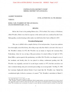 According to Tory Pegram, Campaign Coordinator for the International Coalition to Free the Angola 3, Judge James Brady of the Federal District Court in Baton Rouge “argues that this extraordinary remedy is merited due to the following 5 factors: Mr. Woodfox’s age and poor health, his limited ability to present a defense at a third trial in light of the unavailability of witnesses, this Court’s lack of confidence in the State to provide a fair third trial, the prejudice done onto Mr. Woodfox by spending over forty-years in solitary confinement, and finally the very fact that Mr. Woodfox has already been tried twice and would otherwise face his third trial for a crime that occurred over forty years ago.”
