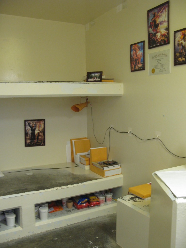 At Pelican Bay, the state’s first and most notorious supermax, the 1,500 occupants of the Security Housing Unit (SHU) and Administrative Housing Unit spend 22.5 hours a day alone in windowless cells measuring about 7 x 11 feet. The remaining 90 minutes are spent, also alone, in bare concrete exercise pens. With no phone calls allowed, and only the rare noncontact visit, these prisoners, like those at ADX and Texas’ Allan Polunsky Unit, can only access the world outside their cells via their “feeding slots.” And their only interactions with fellow prisoners consists of shouting through steel mesh—until the guards order them to shut up.